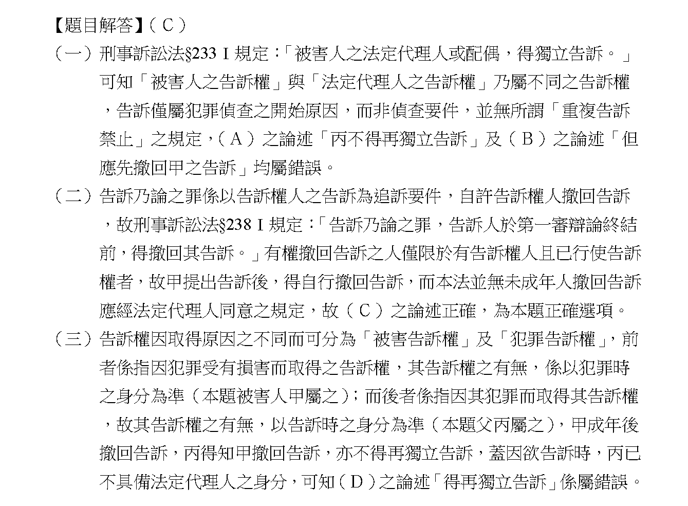 (C)甲提出告訴後,得自行撤回告訴,無須徵得丙之同意